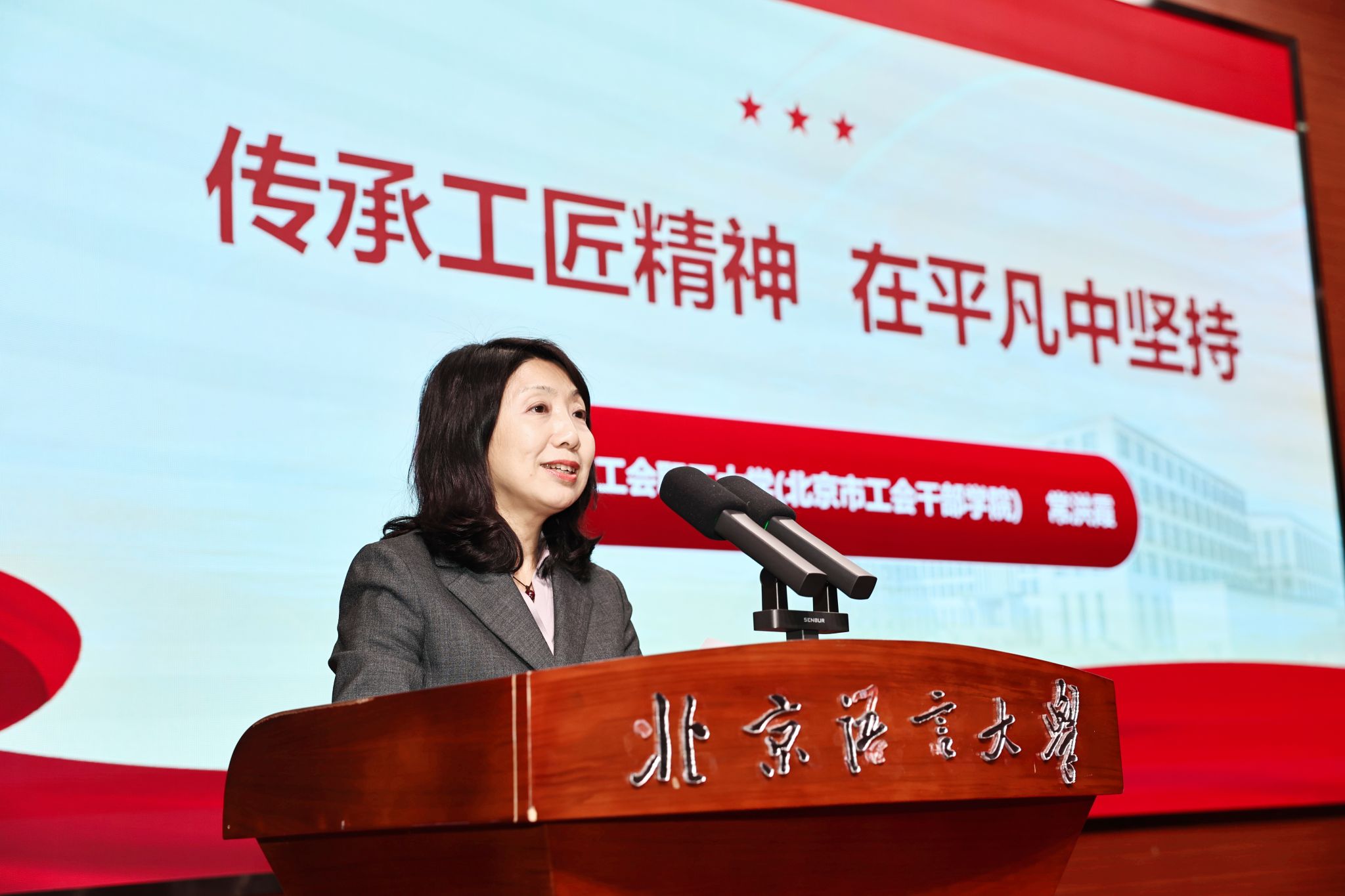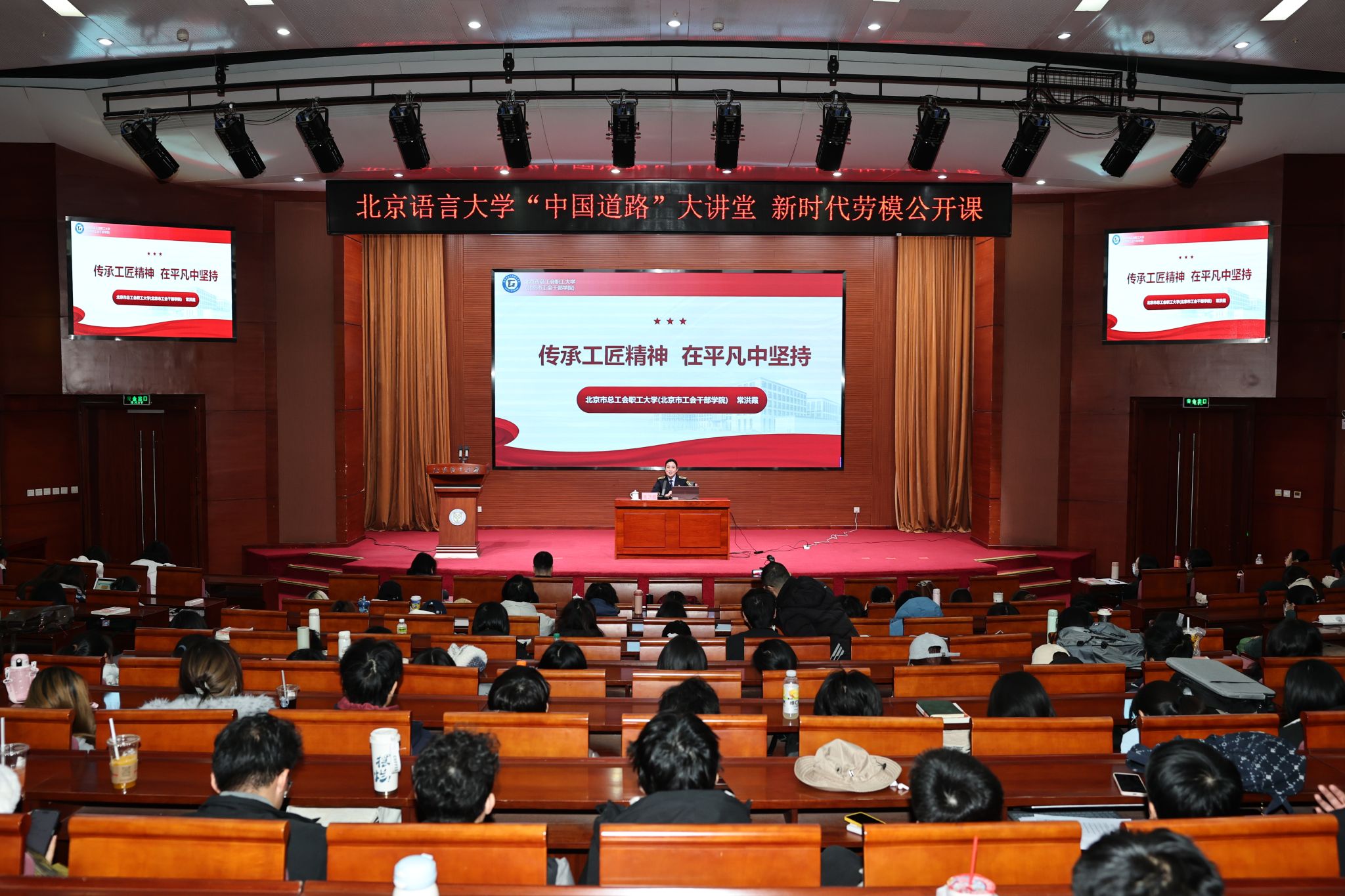 北语新闻网12月5日电(通讯员 马源 董晴柔 摄影 魏达 李倩)为深入阐释中国道路的理论逻辑、历史逻辑与实践逻辑,进一步推动“大思政课”建设走深走实、走向育人实效,12月3日,学校党委宣传部、党委组织部与马克思主义学院联合举办“中国道路”大讲堂暨“新时代劳模公开课”。本次活动特邀全国劳动模范、党的二十大代表、全国五一劳动奖章获得者、北京市“示范性”创新工作室领军人、北京市总工会职工大学(北京市工会干部学院)常洪霞作题为《传承工匠精神 在平凡中坚持》的专题讲座。讲座由党委常委、组织部部长,马克思主义学院党总支书记、院长张健主持。