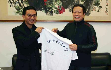 讲座开始前,校党委副书记赵旻教授与郎永淳亲切交流,向郎永淳介绍了我校教育教学发展、校园文化建设等基本情况,郎永淳向赵旻副书记送上亲笔签名的文化衫以作纪念。