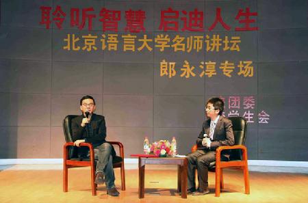 活动中,校团委书记为郎永淳老师颁发了青年成才导师聘书,并对郎永淳老师作客北语表示了热情的欢迎和诚挚的感谢。在接下来的名师讲坛系列活动中,校团委与各校级学生组织将会邀请更多的专家学者,为迎接北京语言大学50周年校庆献上意义深远的贺礼及祝福。