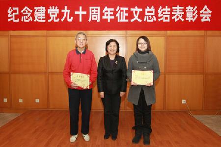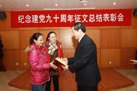12月8日下午,“党旗飘扬我心中”纪念建党九十周年征文总结表彰会在会议中心第一会议室隆重召开。王路江书记宣读了征文获奖名单,并为获得一等奖的师生颁发了证书。霍明杰副书记对此次征文活动进行了总结。赵旻副书记为二等奖、三等奖和优秀奖师生代表颁发了证书。参加表彰会的还有本次征文活动的评委会评委以及获奖师生代表,获奖师生代表们还畅谈了自己对党的认识和获奖感受。