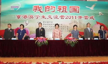 7月20日下午,北京语言大学主楼209报告厅内齐响起了我的祖国—京港澳学生交流营的营歌《友谊连着我和你》,300名来自香港、澳门、北京大、中学校的青年学生带着兴奋与期盼,共同见证了交流营的隆重开营。全国人大常委会副委员长、全国妇联主席陈至立宣布第16届我的祖国—京港澳学生交流营开营,并向本届交流营营长授营旗。全国政协副主席王志珍出席并致辞。