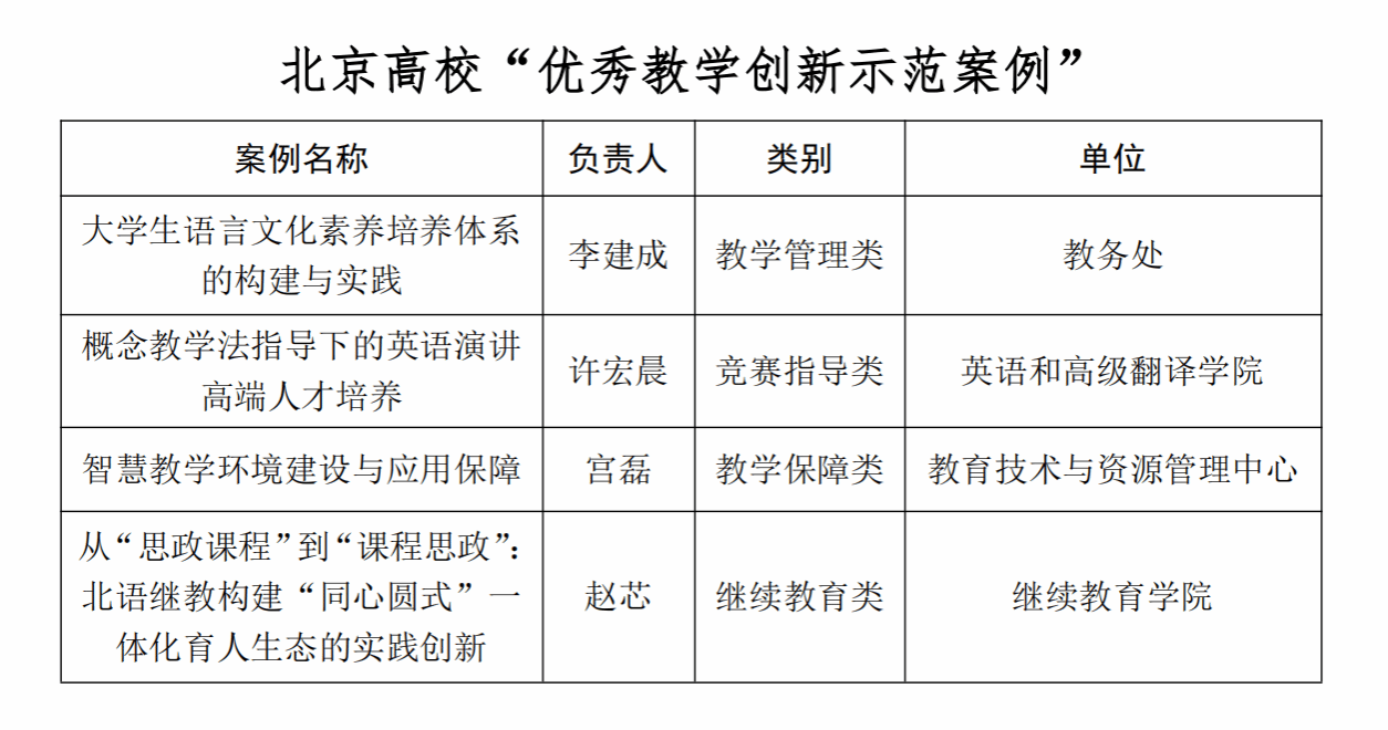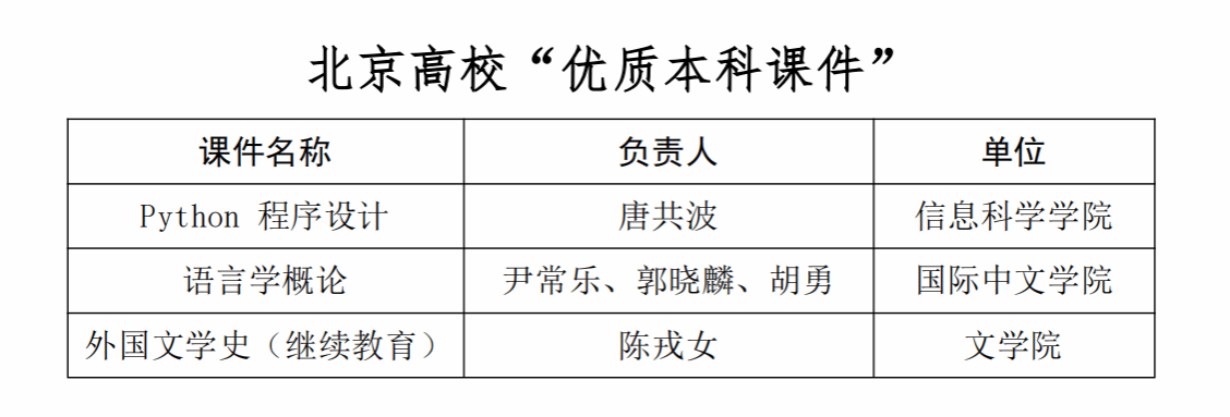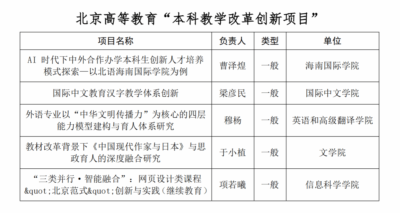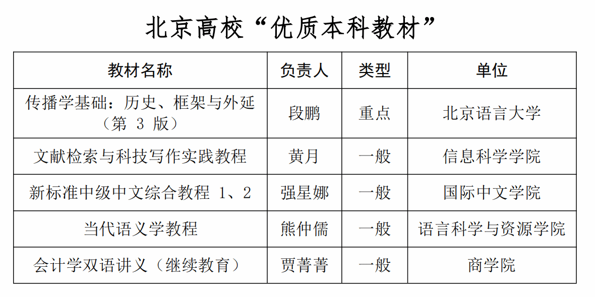 北语新闻网4月1日电(通讯员 张心怡)近日,北京市教育委员会公布了2025年北京高校本科教学项目建设获评(立项、入选)名单,学校共28项获评(批):北京高校“优质本科教材”5项、北京高校“优质本科课程”5项、北京高校“优质本科教案”3项、北京高校“优质本科课件”3项、北京高等教育“本科教学改革创新项目”5项、北京本科高校产学研深度育人平台1项、北京高校“优秀基层教学组织”1项、北京高等学校优秀教学实验室1项、北京高校“优秀教学创新示范案例”4项。具体名单如下: