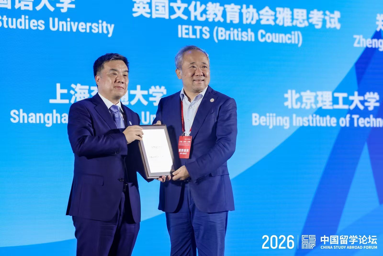 北语新闻网4月14日电(通讯员 郭之恩)4月10日,2026年中国留学论坛暨中国国际教育巡回展在北京国家会议中心举办,来自29个国家和地区的200余所海内外高校与教育机构的近千名代表参会,共同探讨构建可信任、更安全、高质量的全球留学服务体系。教育部副部长任友群以视频致辞。主办方教育部留学服务中心主任王大泉发布多项数据与平台升级成果。段鹏校长受邀出席相关活动,与多国教育界人士展开友好交流,并代表学校接受“中国留学服务中心优秀合作伙伴”荣誉称号。