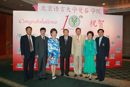 3月17日晚上,崔希亮校长出席了在爱侣湾君悦酒店举行的北京语言大学曼谷学院成立十周年庆典大会。泰国内政部部长陈景镇先生、北京语言大学曼谷学院董事长洪百川先生、泰国易三仓大学校长班差先生、中国驻泰国大使馆一等秘书邱宁先生、泰国妇女协会主席邱夏利女士、泰国华文教师公会主席罗宗正先生,以及曼谷学院的教师和校友等400多人参加了大会。会上,崔希亮校长代表北京语言大学致辞,向北语曼谷学院表示祝贺。