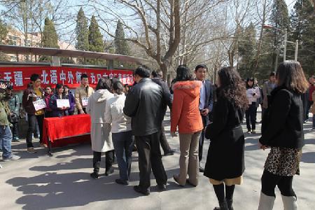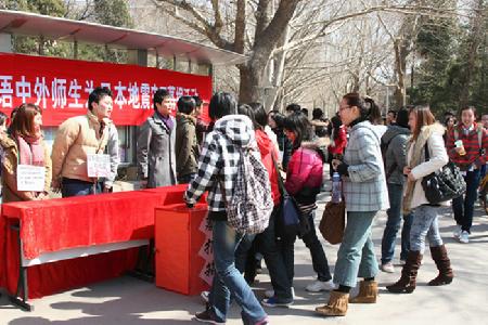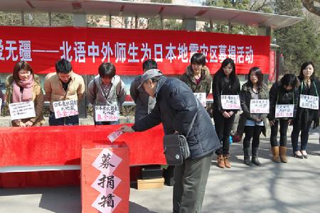 3月16日,北京语言大学举行了“一衣带水、大爱无疆——为日本地震灾区募捐活动”,广大中外师生踊跃为日本地震灾区的民众和来自灾区的日本留学生捐款。此次活动由留学生处、校学生会以及日本留学生联合发起,旨在帮助日本灾区人民和来自灾区的留学生,祈盼日本民众能够早日渡过难关,重建家园。