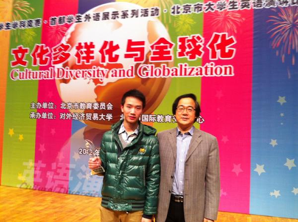 张耀中同学(左)和本届北京市大学生英语演讲比赛组委会副主任、我校英语教育中心主任高明乐老师合影