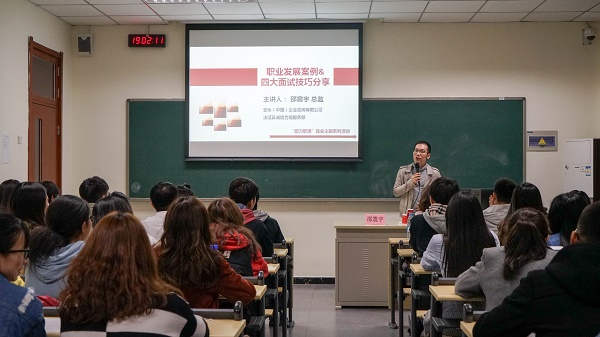 邵震宇先生首先以“年龄”这一话题作为切入口,就如何进行人生规划分享了个人看法。邵总监强调,做好人生规划的第一步应是形成对自身的正确认识,明确自身的年龄、性格特点,并将其作为人生规划的基础。随后,邵先生讲述了自己的工作经历,告诉同学们从事真正适合的工作会积累个人知识与经验,提升自身满足感与幸福感,同时,又通过身边人各异的人生选择,告诫同学们“每个人都是成功的,只是成功的点不一样”,启发同学们学会认清自己、认清现实、认清目标,勇于畅想未来的生活,在人生路上坚定前行。最后,邵总监向同学们分享了面试技巧,特别强调了“真实”与“真诚”二词。在与同学们的互动中,邵总监向同学们展示了面试时应如何进行自我介绍、如何在面试中充分展现出自己的专业知识水平与个人能力水平,并以个人发展与公司战略的平衡为实例,强调了面试时应保持真诚、工作时应始终积极热枕。在提问环节,同学们踊跃发言,邵总监耐心解答,现场气氛活跃。
