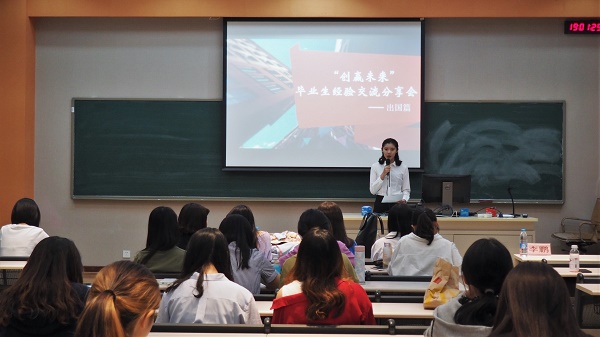 在出国经验交流分享会上,拿到加州大学洛杉矶分校录取通知书的曹心叶建议大家在就业问题上要早有意向,早做准备。她希望同学们能够认识到留学并不是逃避考研和工作的捷径,而是面临更大的挑战。被悉尼大学录取的宋彦蓉从明确目标、备考雅思、收集资源等方面讲述了留学准备的过程。被兰卡斯特大学录取的张思佳从时间安排、语言考试和能力提升等方面与同学们分享了经验,告诫大家要有清晰的自我认知,在大学期间努力提高自身英语水平。拿到伦敦大学国王学院录取通知书的彭奇溶则从申请背景、中介选择、文书准备等方面讲述了自己申请出国的心得体会。被新加坡南洋理工大学录取的千蕙子从前期选择国家地区、学校专业,到中期准备申请材料,再到后期参加笔试面试三个方面详细介绍了自己的经历。