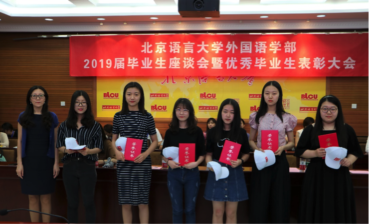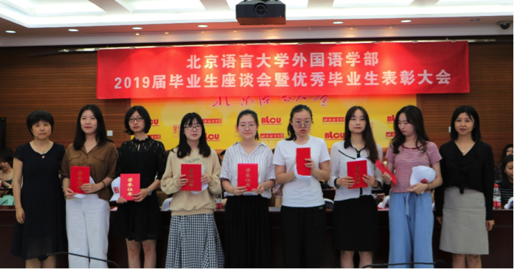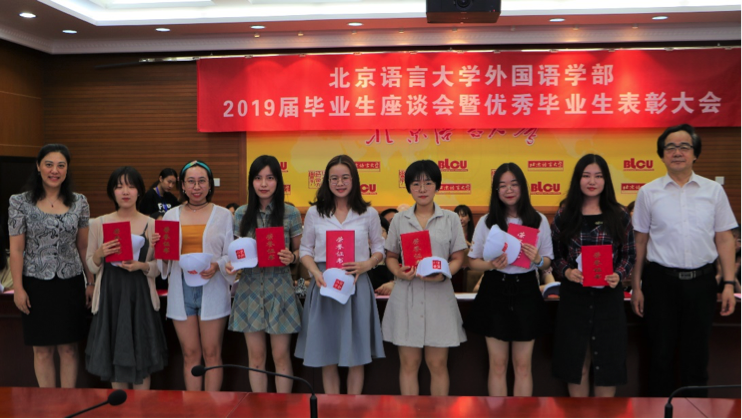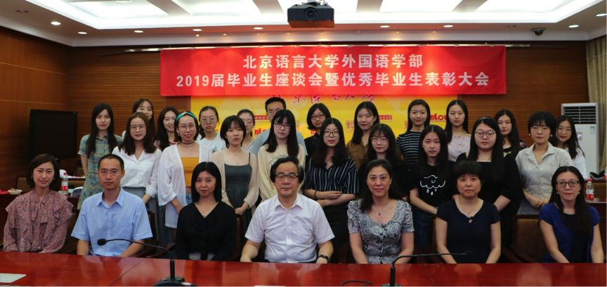 6月12日下午两点,北京语言大学外国语学部2019届毕业生座谈会暨优秀毕业生表彰大会于逸夫报告厅第一会议室顺利举行。出席本次会议的领导有外国语学部主任高明乐、学部党委书记梁清、英语学院院长穆杨、东方语言文化学院院长杨峻、应用外语学院院长陆薇、高级翻译学院负责人王丽虹。西方语言文化学院系主任王秀丽、中东学院系主任陆映波、学部教务办负责人王然以及各学院辅导员作为教师代表参加本次会议。外国语学部2019届毕业生代表参加了本次座谈会。会议由高级翻译学院辅导员王丽媛主持。
