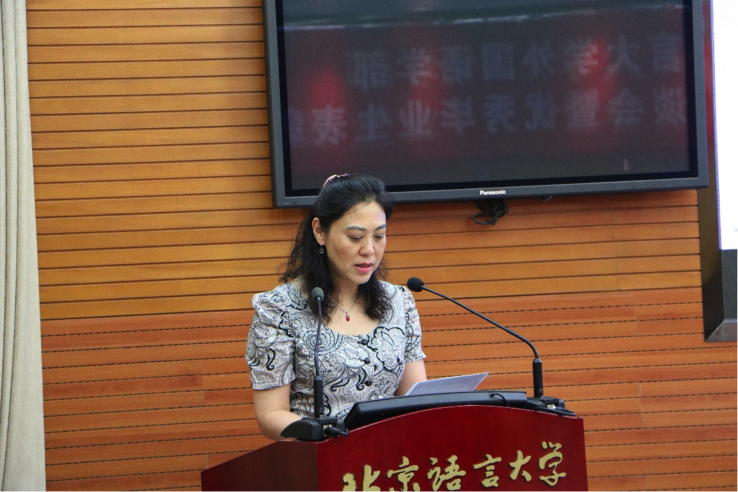 在高明乐教授的讲话中,他向毕业生们表示衷心的祝贺,引导大家思考未来的人生道路,诠释了“研究生”和“工作”的全新含义和目标,希望大家扩大视野,培养君子风范和国际视野;要继续注重语言学习,提高语言运用能力,切忌过分专注理论研究而忽视实践运用,告诫同学们务必进行正确的自我定位。作为学部成立后的第一批学生,本届毕业生见证了学部发展的点滴历程。高老师提出加强营造学部文化,在学术上倡导自由之风,弘扬“教书育人”风范。希望学部和老师更加关心学生,在潜移默化中浸润校园文化,使北语学子充分展现“北语风范”。教授如数家珍,与同学们分享了近年来学科建设巨大进步,学术成果进步,专业语种增多等诸多成就,学部发展蒸蒸日上,各项成就大放异彩。最后高明乐主任代表外国语学部全体老师对2019届全体毕业生送出最真诚的祝福。