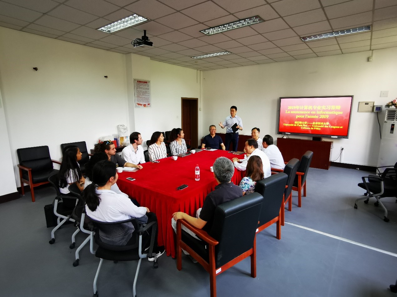 6月18日下午,八位法国南巴黎大学(Université de Paris Sud)计算机专业本科二年级学生,在信息科学学院会议室,参加了欢迎仪式和专业实习答辩,圆满完成了在信息科学学院为期64天的专业实习课程。张旺喜副校长、法国南巴黎大学奥赛学院教务负责人Madame Bonneton女士、北京北语留学服务中心陈庆喜董事长、陈波主任,信息科学学院数字媒体技术专业刘颖滨老师、北京语言大学乔承伟教授出席了会议。会议由信息科学学院党总支书记李超主持他代表信息科学学院,对Madame Bonneton女士和来到北语信息科学学院开展专业实习的法国学生表示热烈的欢迎,并感谢了学校领导、北语留服中心、北语留招办和乔承伟等老师的大力支持。张旺喜校长在致辞中,首先欢迎了法国的老师和学生们,随后介绍了北语和南巴黎大学的合作背景,以及北语信息科学学院的语言智能学科特色。张校长欢迎各位同学以后有机会再来北语学习,并预祝几位同学能够在之后的答辩中,顺利通过。