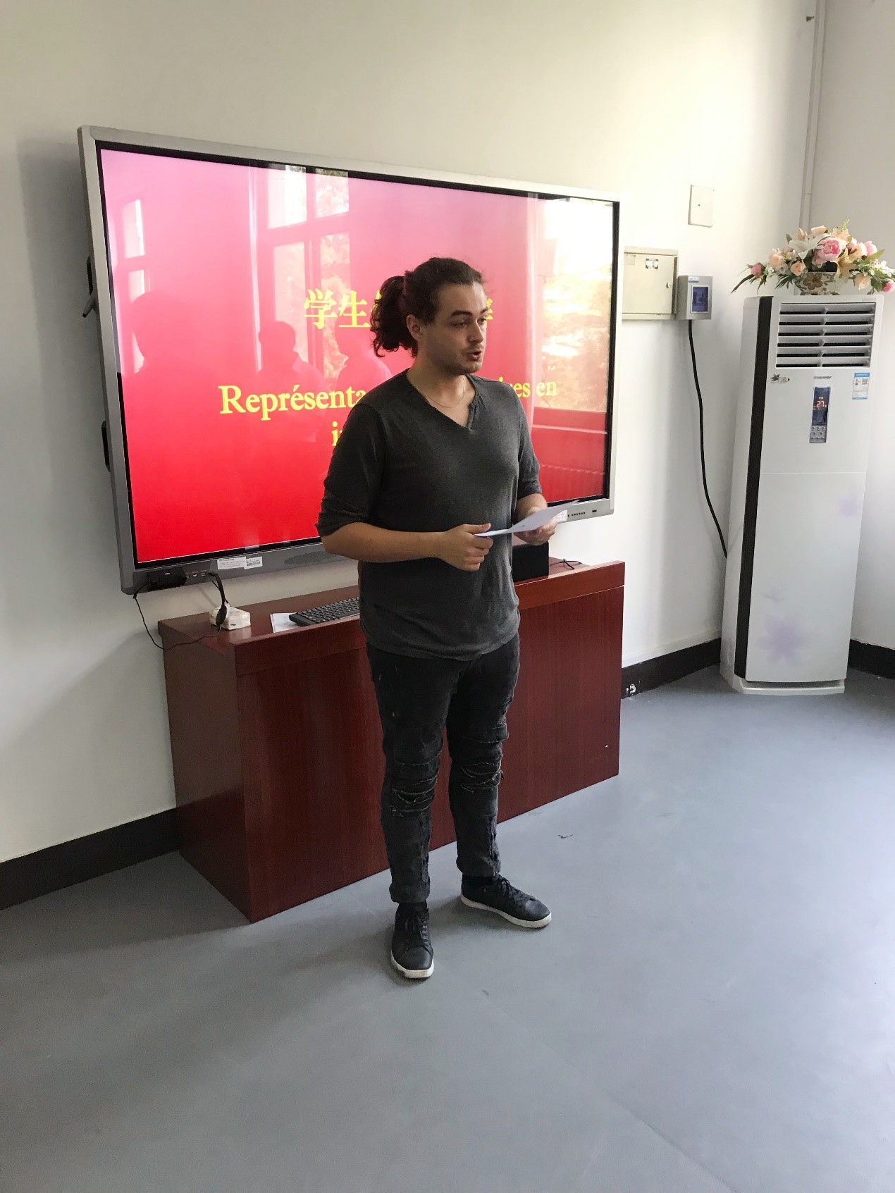Mathias Wilmotte同学作为学生代表,用刚刚学习了一个月的汉语做了致谢发言,博得在场的每一位同学和老师的赞扬。Mathias Wilmotte同学致谢发言中提到,在北语信息科学学院的64天实习时间很短,但给他留下了深刻的印象,特别感谢李超书记、刘颖滨老师,通过他们,对中国、对中国文化有了更深一步的了解,今后,希望再来中国,用自己的专业知识做一名合格的中法文化交流使者。