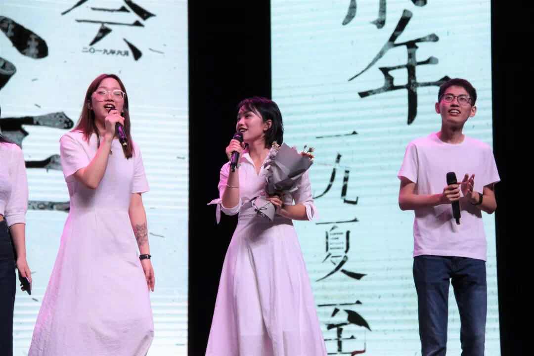 晚19点,晚会正式开始。会场内热切的交谈声随着开场视频的播放而减弱,一幕幕温馨又充满了回忆的画面,带观众席上的同学们回顾了四年大学生活的点滴。任俊杰同学用一首温情的《崇拜》拉开了晚会的序幕,其温暖的歌声与舒缓的曲调相配合,在观众席上的同学们无不深受触动。15级汉语言文学1班的同学,他们为我们带来了一段精彩的舞蹈串烧《舞动青春》,用青春活力感染着在场每一个人。15、16、17、18级汉语言文学2班的同学们,他们带来一出饱含文艺情怀的舞台剧《请回答,中文系2019》。各级同学的齐聚让观众倍感惊喜,戏剧表演与歌曲演唱相结合的形式也让大家更好地感受到了中文系的同学们对本专业的热爱。5级汉教1班同学们为我们带来热情洋溢的歌舞《someone like tsuparu》,台下的观众都挥舞着荧光棒为他们喝彩。人文教务办安倩老师与林建萍老师上台,为大家倾情献唱一曲《同桌的你》,温暖的歌喉与怀旧的曲调令人陶醉其中。谢曾同学与外院的几位同学带来了一首英文歌曲《seasons of love》,冰岛同学Leifur的加入也给我们带来了惊喜,温暖的旋律与美妙的和声表达着他们对母校的爱。15级汉教2班的同学闪亮登场,为大家带来活力四射的《沙雕舞串烧》节目。“真的很不错”、兔子舞、海草舞,他们以经典的舞蹈动作,赢得了大家的阵阵掌声。