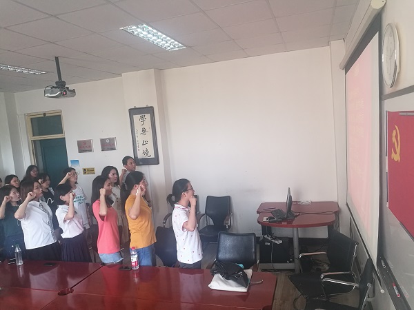 首先,张政老师带领大家重温入党誓词。与会所有党员面向党旗、举起右拳,重温入党时的铮铮誓言和庄严承诺,大家再次受到了心灵的洗礼,产生了强烈的共鸣。
