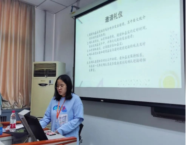 团总支副书记汤思怡发表讲话。她先为大家介绍了团总支四大部门,然后又从会面礼仪、会议礼仪、办公室礼仪和通信礼仪等方面为大家讲解有关团总支在日常工作中的礼仪要求,以便于干事们更好地交流与配合。