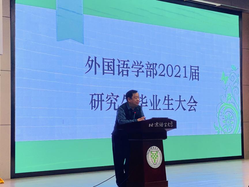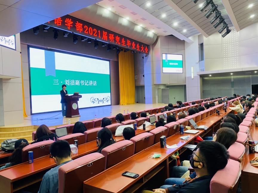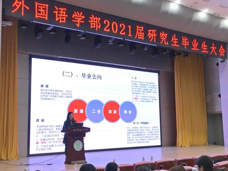 3月30日下午,外国语学部在教一楼209报告厅召开了2021届研究生毕业生大会。会议由学生工作办公室负责人曹鑫老师主持,外国语学部罗林副主任、刘洁副书记、MTI辅导员李晓航老师以及2021届全体研究生毕业生参加了此次会议。