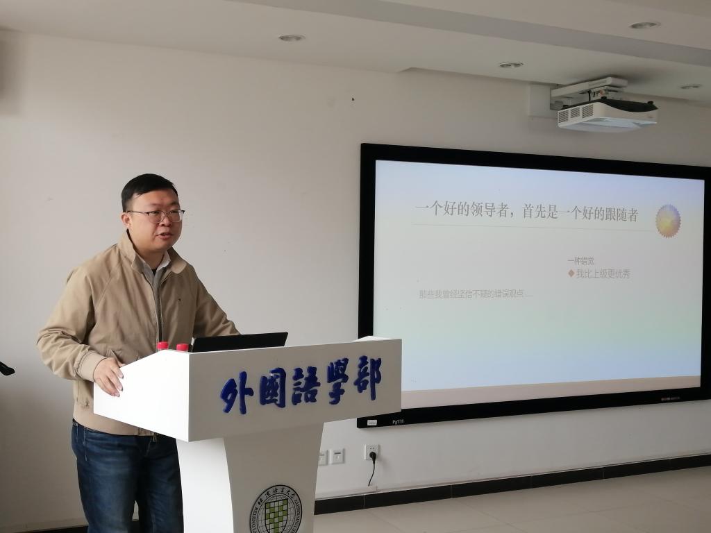 为隆重纪念建党一百年,重温党的光辉历史,外国语学部决定以党史学习为专题,通过参观走访、实践调研、知识竞赛、座谈分享等活动开展一系列以“青春永向党”为主题的学生骨干、学生党员的培养和学习教育活动。4月9日下午,学部学生骨干培训计划第一场讲座在教五311成功举行。06级英语专业校友刘英佳老师就学生干部能力提升问题向各学院团总支副书记和学生会主席团同学分享方法经验。