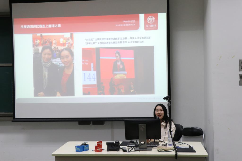 身为蒙特雷国际研究院的学生,李靖琳校友讲述了自己的留学经历,并向同学们分享了自己在蒙特雷的日程表,以现身说法告诉大家,每天坚持练习的重要性。随后,李靖琳校友通过展示自己在外交部翻译司和策马翻译公司的经历,阐述了自己对于翻译这门职业的理解,并让同学们更多地了解了翻译工作背后的故事。