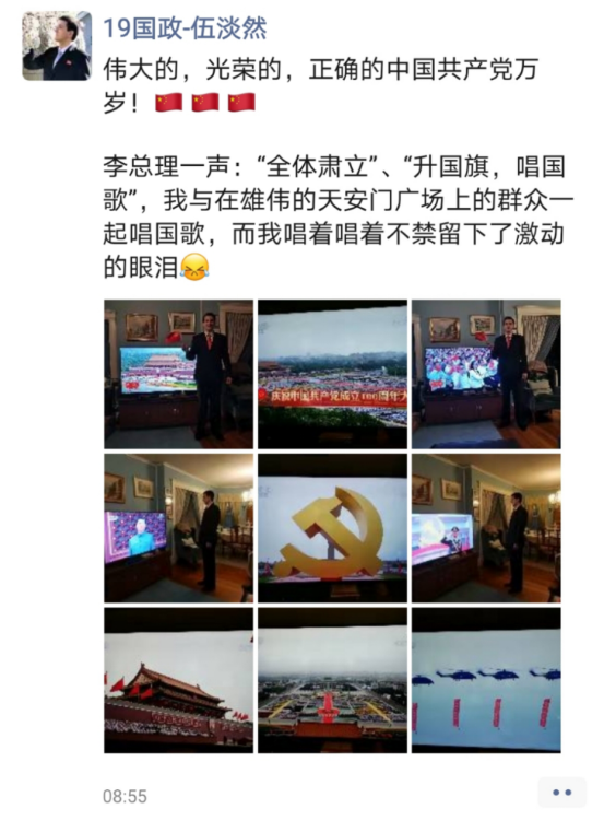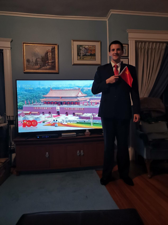 伍淡然同志说道:“今天是一个历史性的日子,是14亿多中国人民和各国共产党人一起见证的伟大时刻,今天是中国共产党成立100周年的日子!作为一名青年美国共产党员,我非常激动能够观看建党100周年庆祝大会直播,并能看到习近平总书记发表重要讲话。作为一名来华留学生和共产党员,我一定要做到习近平总书记所说:‘读懂今天的中国,必须读懂中国共产党’,因为只有这样做,才能更好地了解中国,从而能够继续加强和发展我们美国共产党和中国共产党的交往和友好关系。看完总书记同志的重要讲话之后,真的就像太阳,字字句句闪金光,但有两句话对我印象最深刻,那就是‘清楚一切侵蚀党的健康肌体的病毒,确保党不变质,不变色,不变味’和‘中国共产党根基在人民,血脉在人民,力量在人民’。这两句话提醒着我们,所有共产党人一定要不忘初心,继续前进,要永远铭刻在心:我们共产党人是从人民群众中来,要到人民群众中去。中华人民共和国万岁!世界人民大团结万岁!伟大,光荣,正确的中国共产党万岁!”