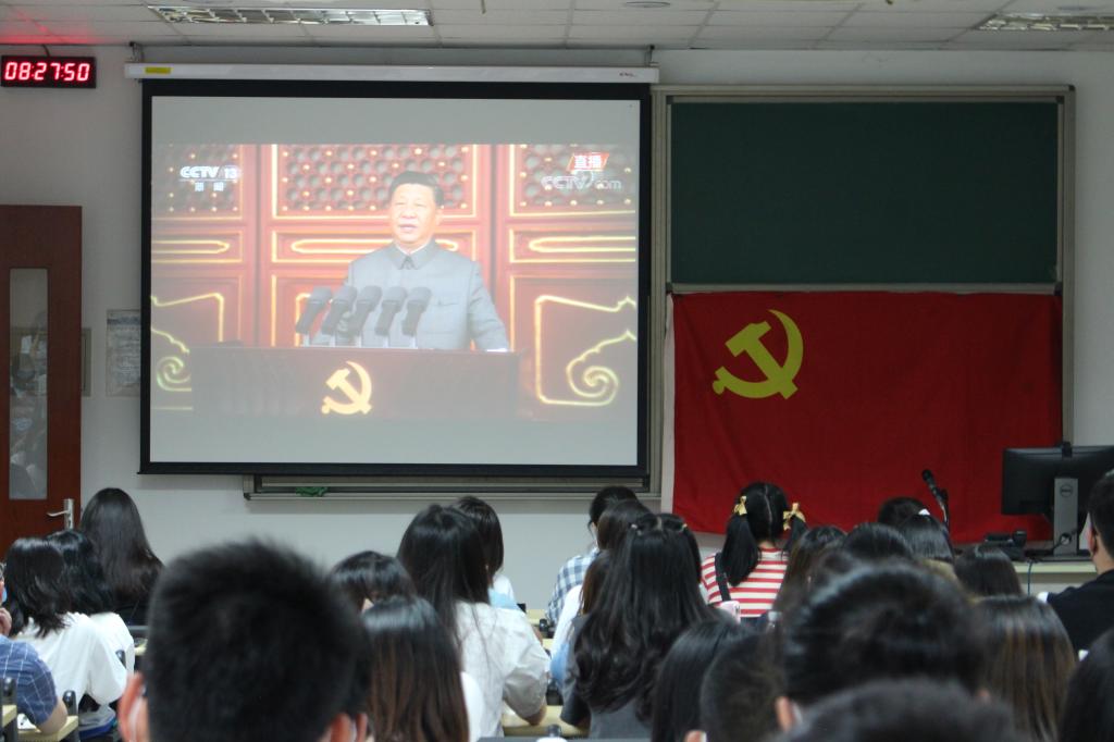 习近平总书记表示,过去一百年,中国共产党向人民、向历史交出了一份优异的答卷,现在,中国共产党团结带领中国人民又踏上了实现第二个百年奋斗目标新的赶考之路。中国共产党立志于中华民族千秋伟业,百年恰是风华正茂。回首过去,展望未来,有中国共产党的坚强领导,有全国各族人民的紧密团结,全面建成社会主义现代化强国的目标一定能够实现,中华民族伟大复兴的中国梦一定能够实现。铿锵话语回荡,师生们沉浸在热烈庄重、恢宏磅礴的庆祝氛围中,认真聆听、掌声不断,共同见证了这历史一刻。