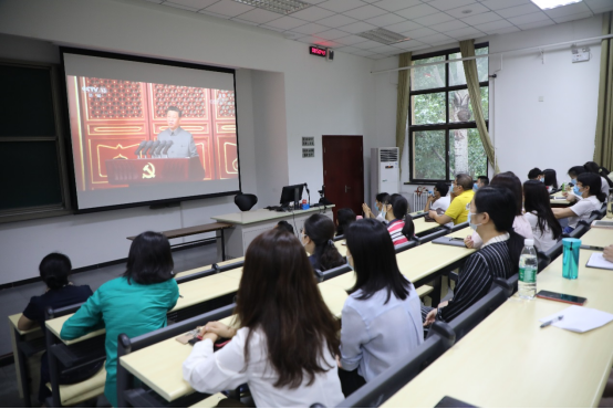 庆祝中国共产党成立100周年大会7月1日上午8时在北京天安门广场隆重举行。中共中央总书记、国家主席、中央军委主席习近平在庆祝大会上发表重要讲话。商学院党总支组织师生党员在主南200教室集中收看现场直播。