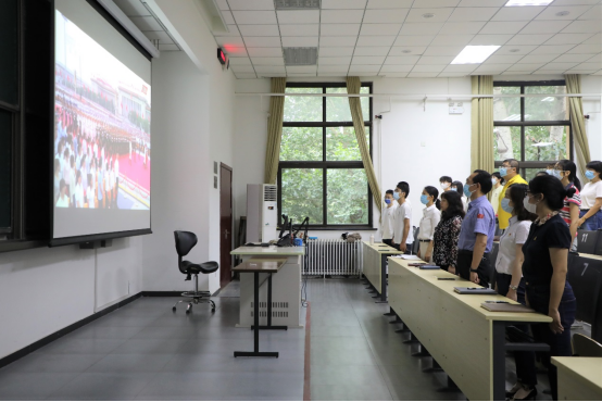 庆祝大会开始后,全体师生党员认真观看由直升机、战斗机组成的空中梯队表演,教室响起阵阵欢呼。大家跟随现场音画同步肃立,注视国旗护卫队官兵在100响礼炮声中护卫五星红旗从人民英雄纪念碑行进至升旗区,升旗仪式开始后全体党员齐唱国歌。随后,在场同志认真学习习近平总书记发表的重要讲话,大家不时地记录笔记,不时地鼓掌欢呼。