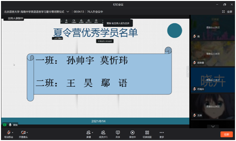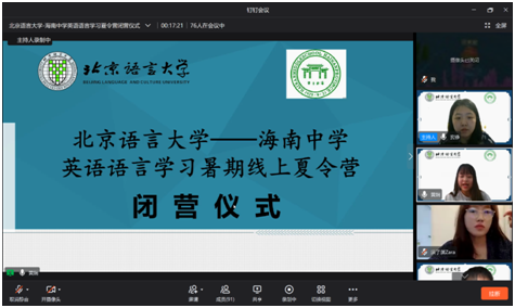 2021年8月14日,同心筑梦,聚力共进——北京语言大学-海南中学英语语言学习暑期线上夏令营闭营仪式顺利举行。海南中学副校长陈辉、国际交流中心主任宿慧美、国际交流中心副主任张侃、一班班主任张媛、钟亚琴,二班班主任李智、顾青雨,北京语言大学人文社会科学学部党委书记张阳、团委书记玄铮、辅导员朱衍行出席闭营仪式,讲师团全体学生讲师与营员们参加活动。闭营仪式由北京语言大学2019级国际政治专业本科生黄娴主持。