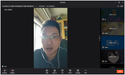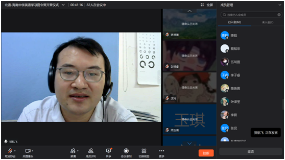 首先,海南中学教务科科长贺航飞老师介绍了本次夏令营的具体情况,对北京语言大学实践团成员表示了感谢与欢迎,表示疫情阻挡不了我们相聚在一起学习和交流的热情。同时,他也对全体营员提了几点要求,希望同学们能够团结友爱,相互体谅,在线上课程中做好自我管理,并保持这份学习的热情,为即将到来的高中生活做好准备。