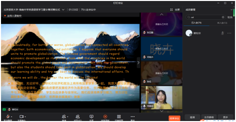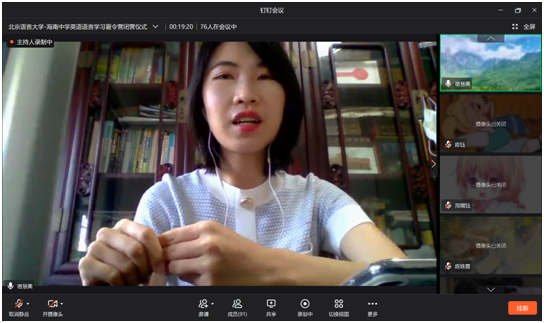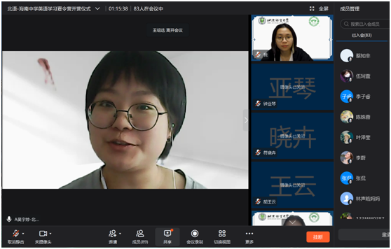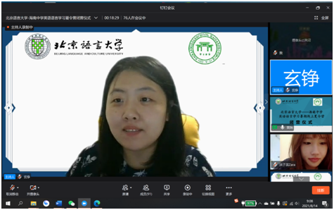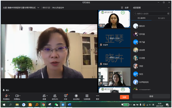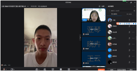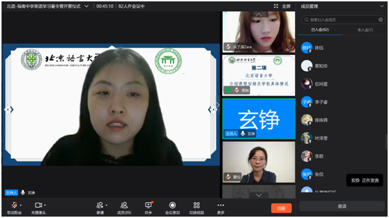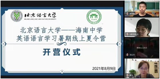 2021年8月9日上午,北京语言大学-海南中学英语语言学习暑期线上夏令营举行线上开营仪式。海南中学教务科科长贺航飞、国际交流中心主任宿慧美、国际交流中心副主任张侃、一班班主任张媛、钟亚琴,二班班主任李智、顾青雨,北京语言大学一带一路研究院副院长黄悦、北京语言大学国际关系学院教研室主任胡王云、人文社会科学学部团委书记玄铮、辅导员朱衍行以及本次北语夏令营讲师团成员和营员参加开营仪式,仪式由北京语言大学2019级国际政治专业本科生黄娴主持。