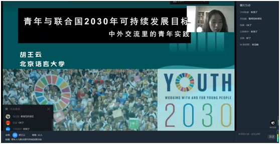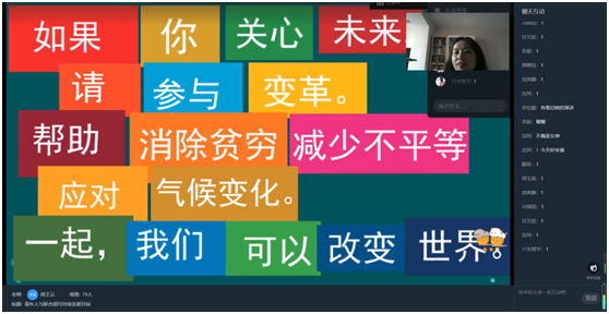 讲座中,胡王云老师以北语“小联合国”为例,列举了北语举办的“大使看世界”系列讲座、国际组织人才训练营以及承办的中国国际公务员培训班,为我国培养出了大量“外语+专业”、“知识+能力”、“中国通+全球通”的复合型国际化人才。她还指出,对于青年人来说,在推动SDGs落实的过程中,不仅仅可以通过担任国际公务员参与全球治理,也可以通过提升自己的全球胜任力,真正让自己切实地参与到推动SDGs实现的公益活动中去。要去对标面向未来的青少年的核心素养,切实了解不同的文化、学习如何解决与他人的冲突、扩充知识面、关心关注解决全球问题的主题活动,将个人担当与全球发展相结合,在尊重文化差异的同时不忘文化自信,同学们纷纷表示受益匪浅。最后,老师用一份倡议与大家共勉:如果你关心未来,请参与变革。帮助消除贫困减少不平等,应对气候变化。一起,我们可以改变世界。