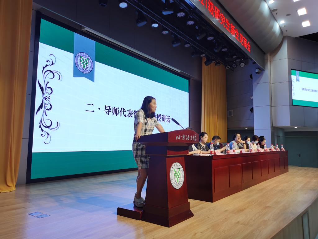 接着,导师代表、俄语语言文学学科负责人管玉红教授在讲话中强调,希望莘莘学子们在读研期间培养自己完整独立的人格。对此,她深情寄语全体新生:第一,培养出众的专业能力。在醉心学术的同时,要注重科学的思维方法的训练;第二,培养明确的主体意识。增强定力,不忘初心,潜心做好自己;第三,培养准确恰当的沟通和表达能力,提醒大家走出网络,更多进行现实的沟通和交流。