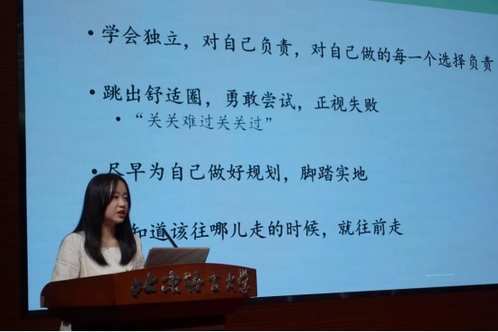 随后,李艳同学讲述了自己的学习方法,以及自己在学习之余三年宝贵的院会工作经历,鼓励同学们在坚持学习的同时,积极参与课外活动以提高自身能力、丰富经验。