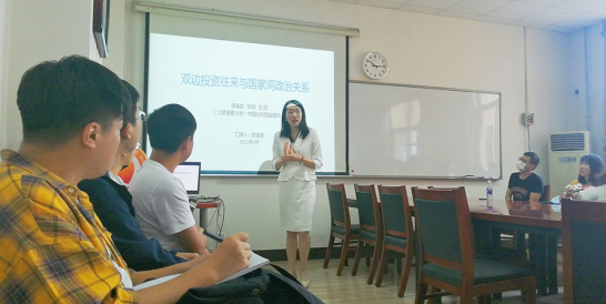 交流环节,商学院副院长宋晓玲教授向陈胤默老师提出变量定性和定量的选取以及样本量该如何扩充的问题,张原教授就论文中投资数据选取的口径、异质性等对国家间关系的不同影响等问题与陈胤默老师进行了探讨交流。金莹老师就研究方向的范畴和竞争机制理论与陈胤默老师交换意见。同学们也纷纷向陈胤默老师了解并学习国际关系变量的量化以及对于中国处理国际关系的实用性等问题。陈胤默老师对此一一做出了详细解答,表示由于选题的视角比较新颖,国内外相关文献较少,样本总量在现阶段的研究中还远远不够,会在后续的研究中扩充数据容量以及进一步完善理论机制。
