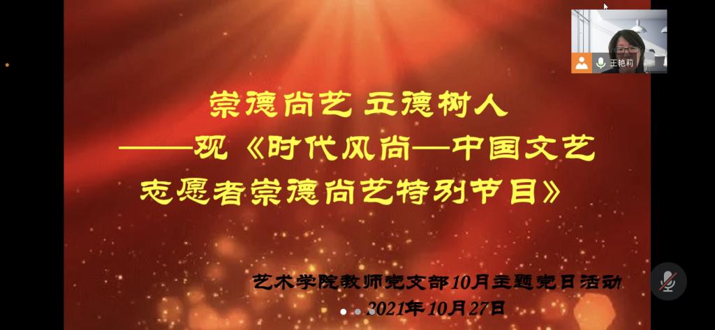 “文艺是时代前进的号角,最能代表一个时代的风貌,最能引领一个时代的风气。” 党的十八大以来,习近平总书记多次寄语广大文艺工作者,要求大家把崇德尚艺作为一生的功课,努力追求真才学、好德行、高品位,做到德艺双馨,成为先进文化的践行者、社会风尚的引领者。 10月27日,艺术学院教师党支部以“崇德尚艺,立德树人”为主题开展党日活动。活动以集体观看《时代风尚——中国文艺志愿者崇德尚艺特别节目》并分享心得体会的形式开展,结合认真学习习近平总书记致文艺工作者的箴言,取得了良好的学习效果。支部10名党员同志参加活动,支部书记王艳莉老师主持分享会。