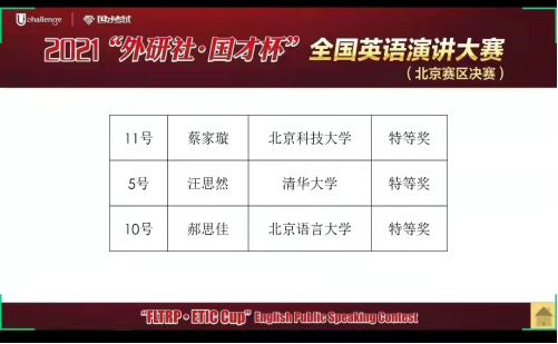 10月30日,2021年度“外研社·国才杯”全国英语演讲大赛北京赛区决赛顺利落幕。在英语学院的大力支持以及穆杨老师的悉心指导下,2019级英语专业郝思佳同学取得了特等奖的佳绩。
