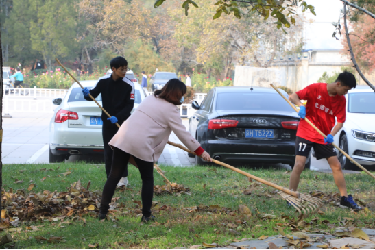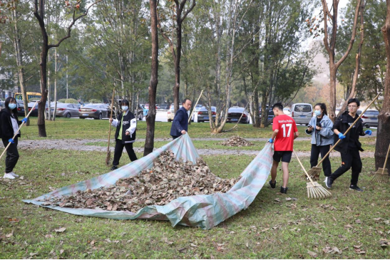 在“劳动教育月”活动启动仪式上,黄益方副校长进行了动员讲话,后勤服务集团党总支书记谢刚、副总经理苏东向同学们讲解了劳动教育的重要性以及活动的相关安排。商学院党总支书记张政、党总支副书记张坤和2021级辅导员刘慧璐带领2021级金融1班、2班和3班的全体同学,共同清理了学院所属责任区内的枯枝落叶,并在后勤物业师傅们的指导下采摘柿子。