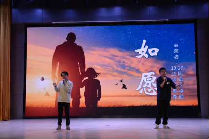 歌声悠扬,每个人都听到属于自己的故事。西语歌曲《si tú》被21级西班牙语2班的同学们演绎更加细腻,动听的旋律变成一道道绚丽的晚霞,美妙的音符幻成一只只五彩羽毛的小鸟,飞向全场的观众,栖息在筑满音乐的心巢之中。