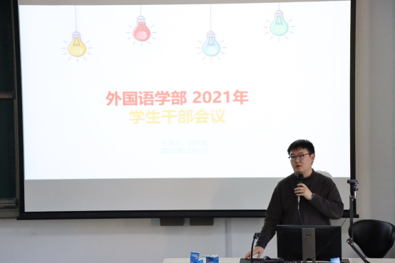 12月1日中午,外国语学部2021年学生骨干培训会在主南200顺利开展,外国语学部2019-2021级各班班长、团支书及各学院团学骨干参加了本次大会。出席本次大会的有外国语学部党委副书记刘洁老师,英语学院辅导员高睿璇老师、唐诗琪老师,东方语言文化学院辅导员毛星月老师、张嘉程老师,西方语言文化学院辅导员殷丛丛老师、付劲松老师、孙凝风老师,中东学院辅导员阳融寒老师。本次大会由高级翻译学院辅导员刘文韬老师主持。
