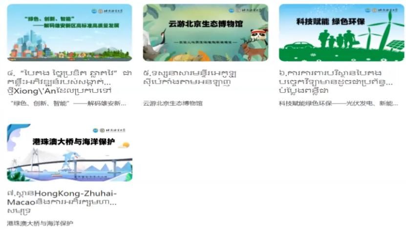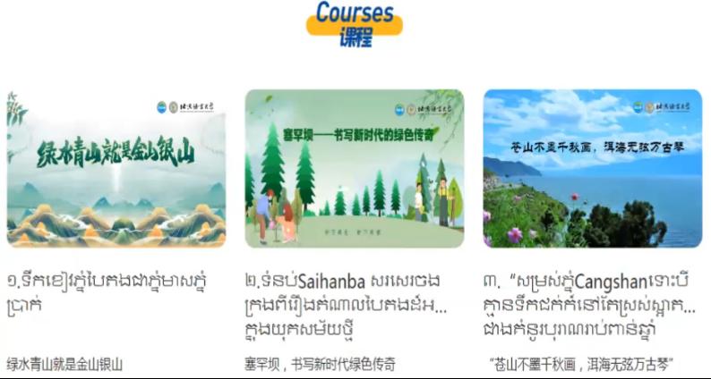本次冬令营为期7天,学员主要为柬埔寨金边皇家大学的学生和当地的中国文化爱好者。课程采取实时授课、在线体验和录播课程相结合的方式,以“生态环保”的价值观念为基础,设计了一系列语言文化课程,在中文教学的同时,展示了塞罕坝、苍山和洱海、雄安新区白洋淀、北京生态博物馆、科技赋能绿色环保、港珠澳大桥等中国“绿水青山”的自然风光和环保成就。