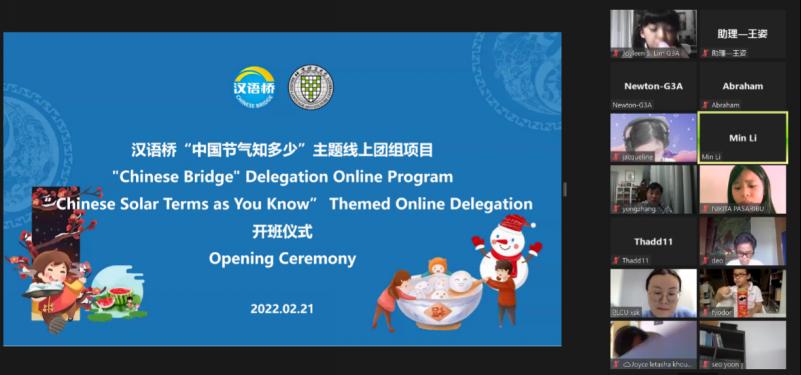 由教育部中外语言交流合作中心主办、北京语言大学承办的2021汉语桥“中国节气知多少”线上团组二期课程于近日结营,项目顺利收官。本次项目历时一个月,分中学组和小学组两期课程。一期课程的内容针对中学生,已在春节前完成;二期课程的对象是小学生,在明媚的春天里如期举行。