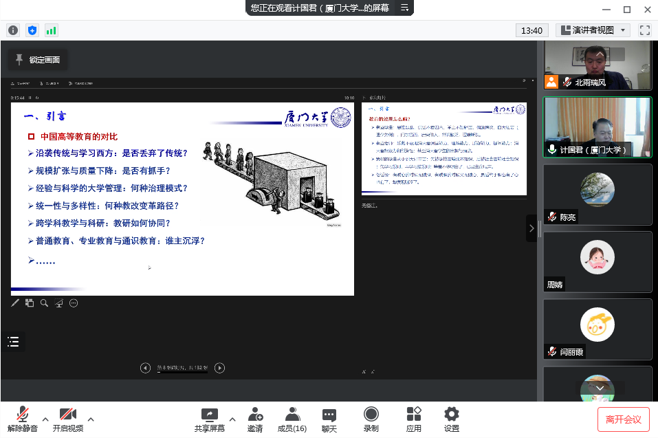 3月29日上午,高教前沿系列讲座第12期开讲,本次讲座特邀厦门大学教务处处长计国君教授,主题为“新时代大学教育教学设计”,讲座以线上线下相结合的方式进行。学部(院)教学负责人及教务处全体人员参加了此次讲座。