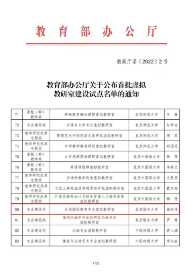 今年2月,教育部办公厅公布了教育部首批虚拟教研室建设试点名单,由北京语言大学教师教育学院牵头申报的汉语国际教育专业虚拟教研室成功入选。作为1985年获批设置专业的国内首所高校,作为国家级一流本科专业、教育部特色专业建设点和全国高校黄大年式教师团队承建的学校重点专业,北京语言大学汉语国际教育专业积累了人才培养、专业建设和学科建设的丰富经验,特色鲜明,优势突出,是专业建设的标杆和示范高校。