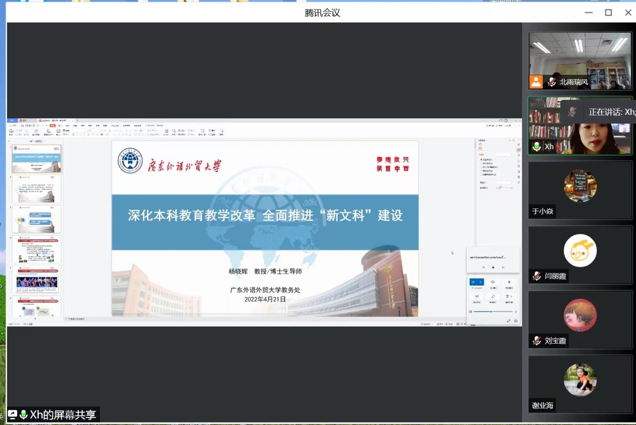 4月21日下午,高教前沿系列讲座第14期开讲,本次讲座特邀广东外语外贸大学教务处处长杨晓辉教授,主题为“深化本科教育教学改革 全面推进‘新文科’建设”,讲座以线上线下相结合的方式进行。学部(院)教学负责人及教务处全体人员参加了此次讲座。