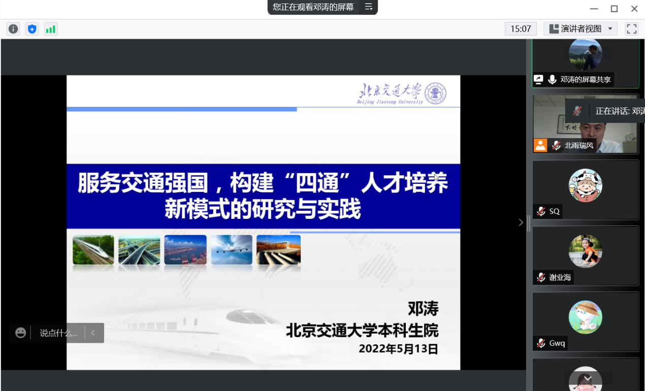 5月13日下午,高教前沿系列讲座第15期开讲,本次讲座特邀北京交通大学本科生院副院长邓涛教授,主题为“服务交通强国,构建‘四通’人才培养新模式的研究与实践”,讲座以线上方式进行。学部(院)教学负责人及教务处全体人员参加了此次讲座。