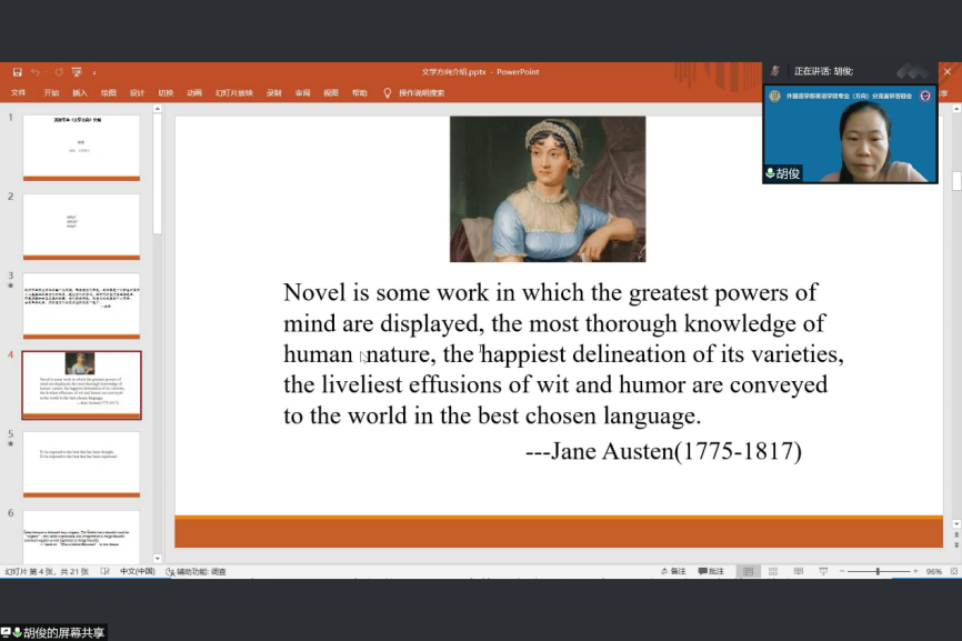 接下来,英语专业(文学方向)主讲人胡俊教授以几段各有千秋的文学节选引入主题,向我们展现了一个美好而有力量的文学世界。胡俊教授就本专业的定位及目标,文学方向学习的课程设置、培养目标以及发展方向做出了详细解释,带领同学们一步步加深了对文学方向学习内容及意义的理解。
