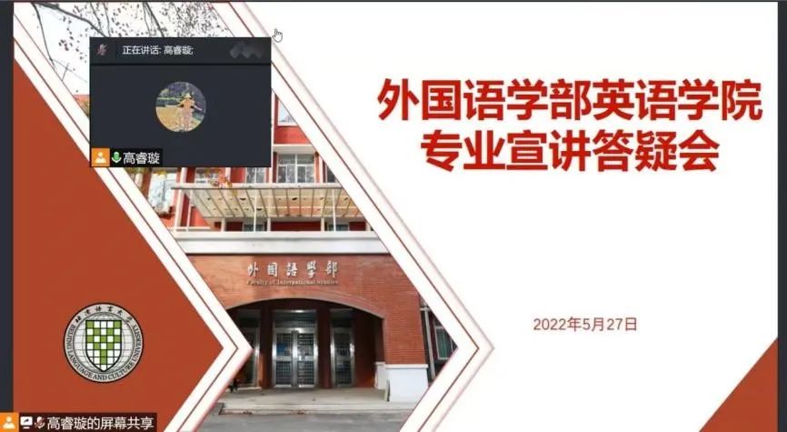 5月27日下午,外国语学部英语学院如期于腾讯会议线上召开第二场分流工作专业宣讲会。英语学院院长穆杨教授,负责主讲各专业方向的吴平教授、胡俊教授、王立非教授、孙昊宇老师和周思蕊老师,辅导员高睿璇老师、唐诗琪老师共同出席了本次会议。会议由高睿璇老师主持。本次宣讲会围绕学科发展现状、可选课程情况、不同选择方向的未来就业或升学可能等做出了详尽解释,为同学们的选择提供了可靠的支持。