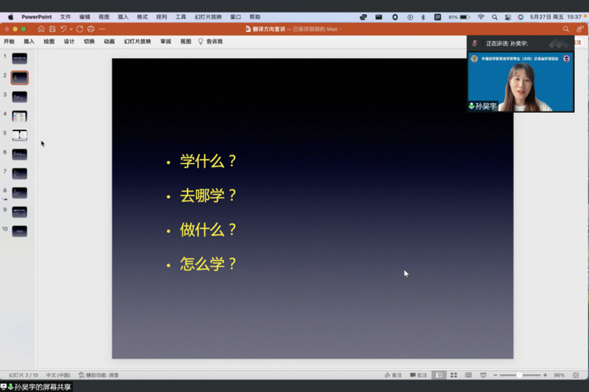 之后,英语专业(翻译方向)主讲人孙昊宇老师从工作中的实例出发,用轻松的语言向同学们点明了翻译人才的重要性和不可替代性。随后,孙昊宇老师向同学们具体介绍了翻译方向的学习内容、人才培养目标、深造方向、未来就业方向和学习方法。最后,孙昊宇老师祝愿同学们学有所成,并为同学们的提问进行了详细解答。