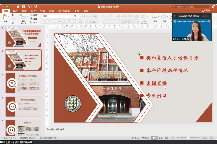 会议持续推进,英语(英西复语)专业主讲人周思蕊老师向同学们详尽介绍了英西复语方向人才培养目标、本科阶段课程情况、出国交换项目和专业出口方向。周思蕊老师强调了培养英西复语人才对国家“一带一路”战略的重要意义,并向同学们阐述了攻读英西复语方向的升学就业优势,细致的讲述令同学们对英西复语的学习有了更清晰的了解与规划。
