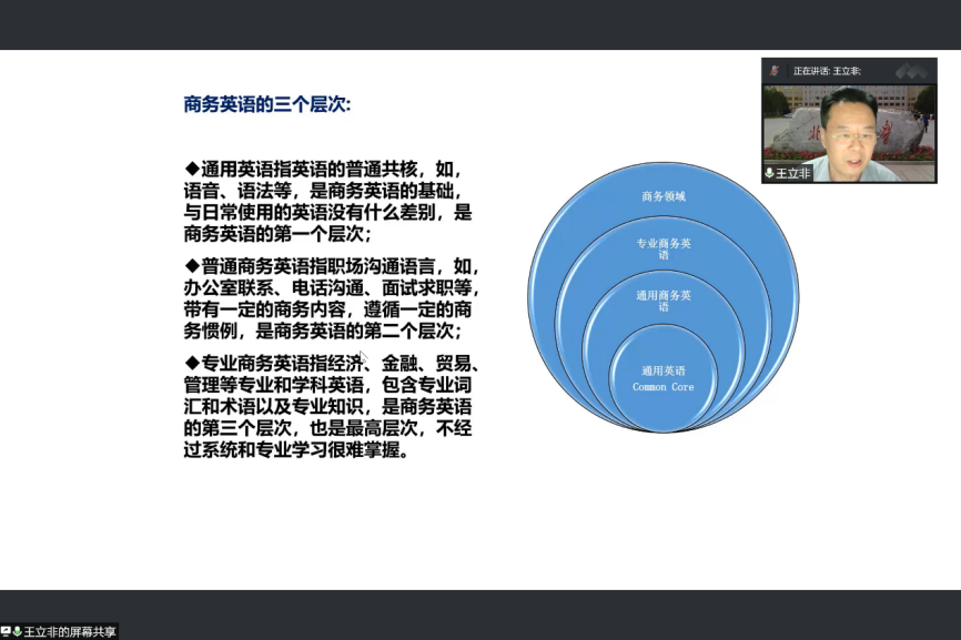 随后,商务英语专业主讲人王立非教授以“Let’s talk business.”这有趣又彰显专业特色的语句直入正题,向同学们详细介绍了商务英语的基本概念、发展历史及近况、教育使命、教学内容和人才培养目标。王立非教授还强调在数字化和人工智能普及的当今世界中,商务英语发挥着巨大作用。最后,王立非教授鼓励同学们刻苦学习,克服困难,成就自己,并为同学们进行了耐心答疑。