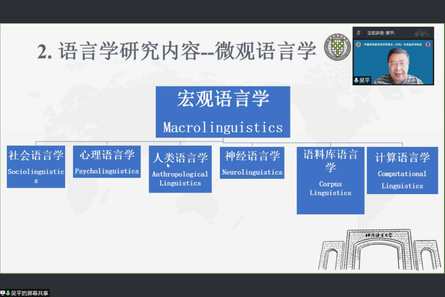 会议伊始,英语专业(语言学方向)主讲人吴平教授针对语言学方向的模块属性、研究内容、主要研究方法、新时代科学研究领域和专业毕业去向进行了富有逻辑的清晰解读,加深了同学们对语言学方向的全方位了解。接着,穆杨教授有感而发,对相关内容做出了进一步的阐释。